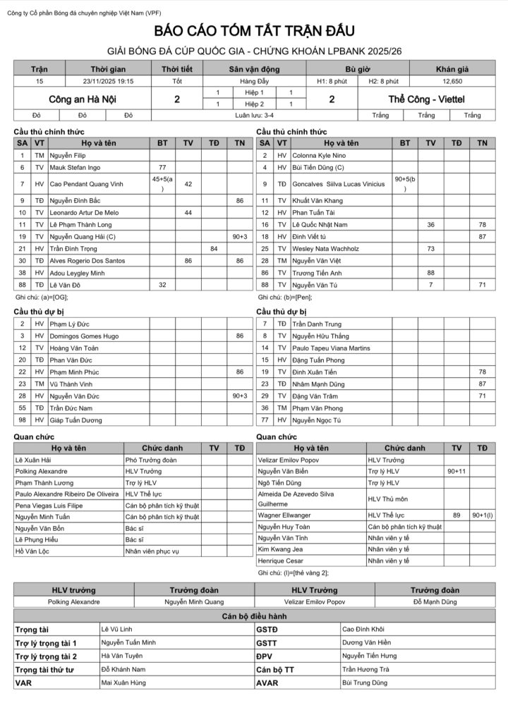 Báo cáo trận đấu CLB Công an Hà Nội vs CLB Thể Công Viettel (vòng 1/8 Cúp Quốc gia Chứng khoán LPBank 2025/26)