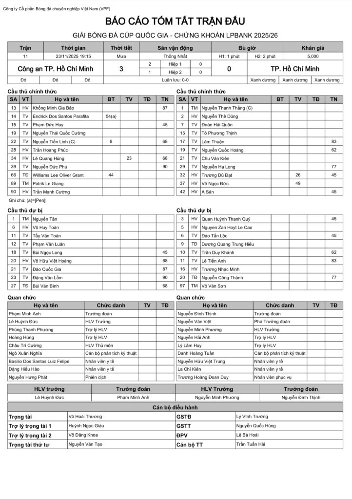 Báo cáo trận đấu CLB Công an TP.HCM vs CLB TP.HCM (vòng 1/8 Cúp Quốc gia Chứng khoán LPBank 2025/26)