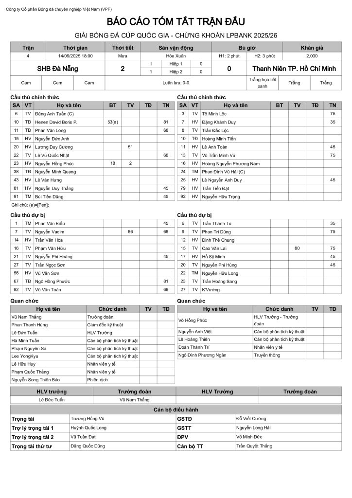 Báo cáo trận đấu CLB SHB Đà Nẵng vs CLB Thanh Niên TP Hồ Chí Minh (vòng loại Cúp Quốc gia – Chứng khoán LPBank 2025/26)