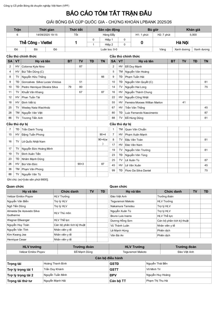 Báo cáo trận đấu CLB Thể Công Viettel vs CLB Hà Nội (vòng loại Cúp Quốc gia – Chứng khoán LPBank 2025/26)