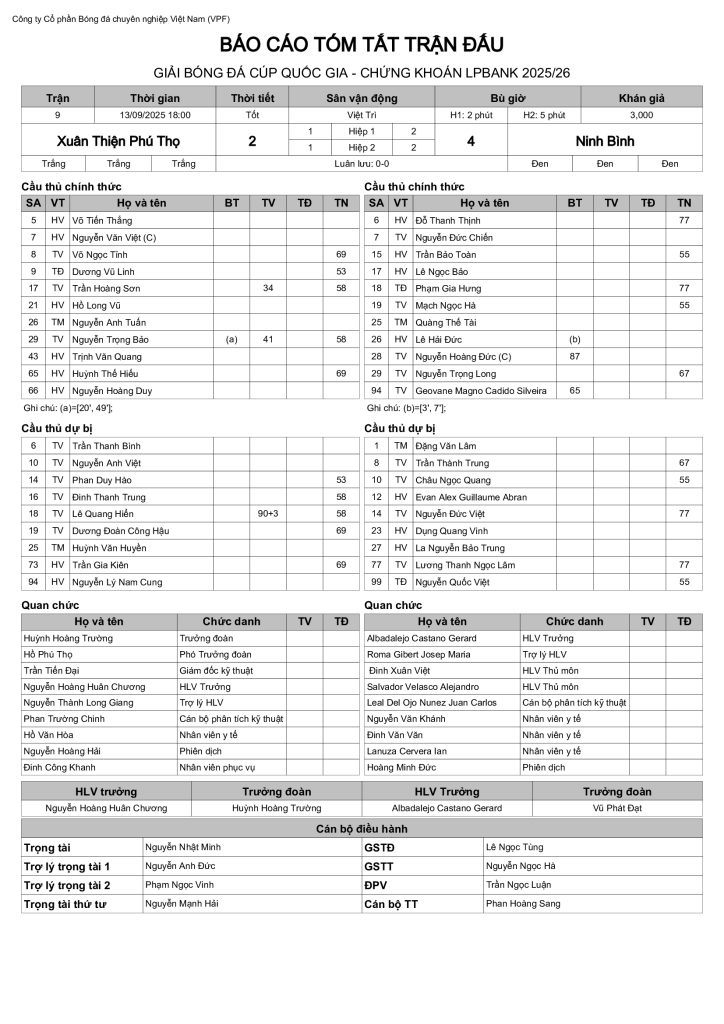 Báo cáo trận đấu CLB Xuân Thiện Phú Thọ vs CLB Ninh Bình (vòng loại Cúp Quốc gia – Chứng khoán LPBank 2025/26)