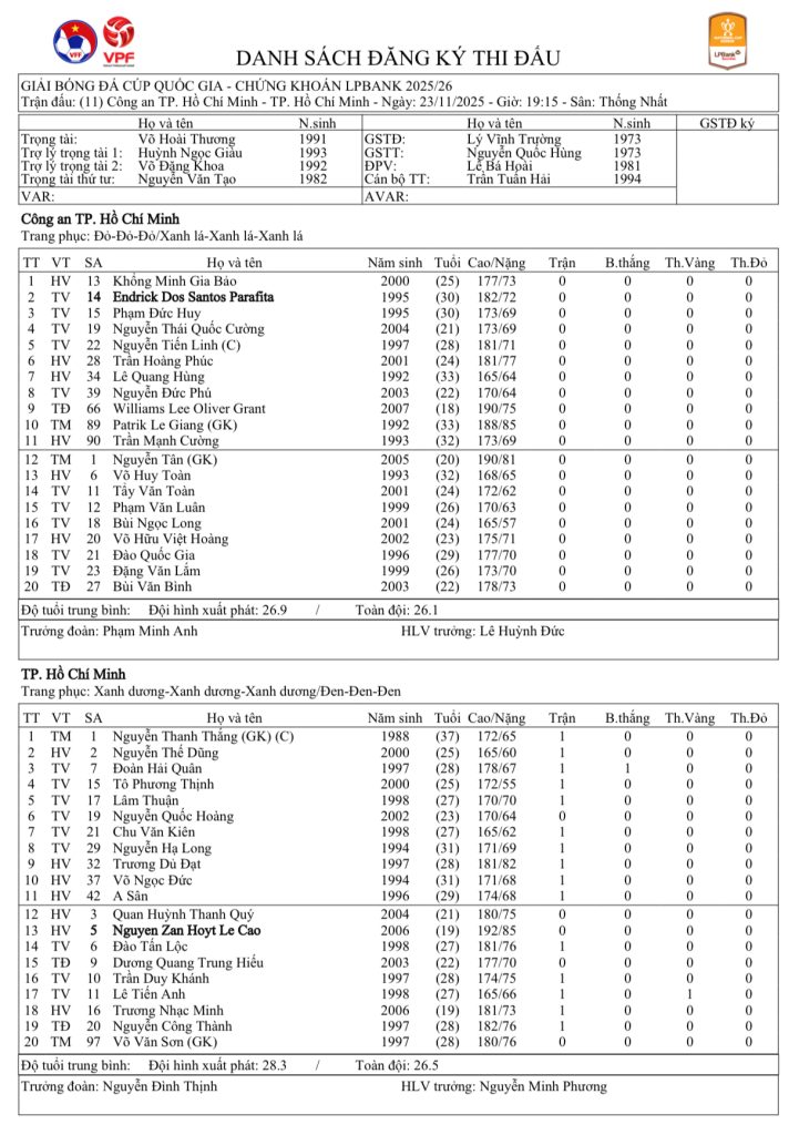 Danh sách đăng ký thi đấu CLB Công an TP.HCM vs CLB TP.HCM (vòng 1/8 Cúp Quốc gia Chứng khoán LPBank 2025/26)