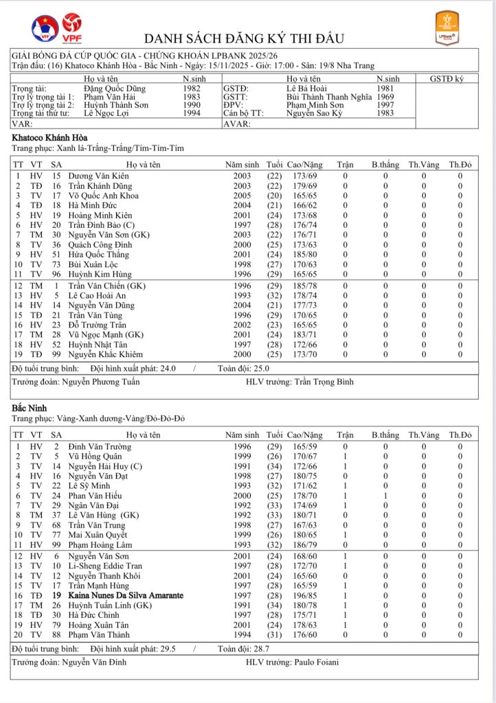 Danh sách đăng ký thi đấu CLB Khatoco Khánh Hoà vs CLB Bắc Ninh (vòng 1/8 Cúp Quốc gia Chứng khoán LPBank 2025/26)
