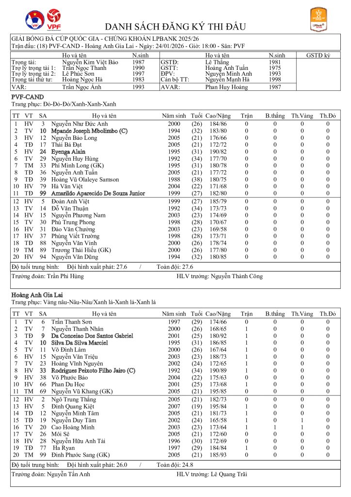 Danh sách đăng ký thi đấu CLB PVF CAND vs CLB Hoàng Anh Gia Lai (Tứ kết Cúp Quốc gia Chứng khoán LPBank 2025/26)