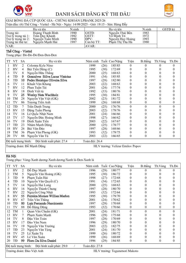 Danh sách đăng ký thi đấu CLB Thể Công Viettel vs CLB Hà Nội (vòng loại Cúp Quốc gia – Chứng khoán LPBank 2025/25)