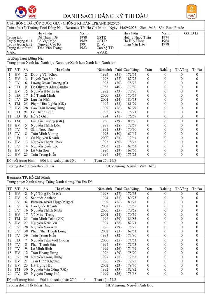 Danh sách đăng ký thi đấu CLB Trường Tươi Đồng Nai vs CLB Becamex TP Hồ Chí Minh (vòng loại Cúp Quốc gia – Chứng khoán LPBank 2025/26)