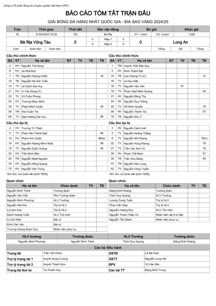 Báo cáo trận đấu CLB Bà Rịa Vũng Tàu vs CLB Long An (vòng 16 HNQG Bia Sao Vàng 22024/25)