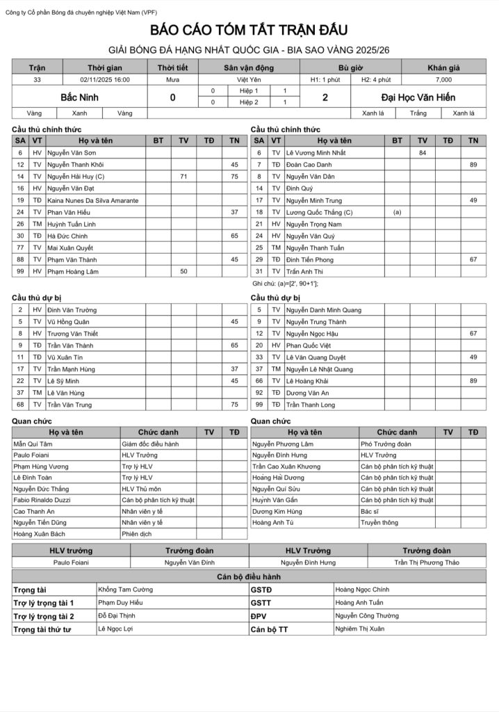 Báo cáo trận đấu CLB Bắc Ninh vs CLB Đại Học Văn Hiến (vòng 6 VĐQG Bia Sao Vàng 2025/26)