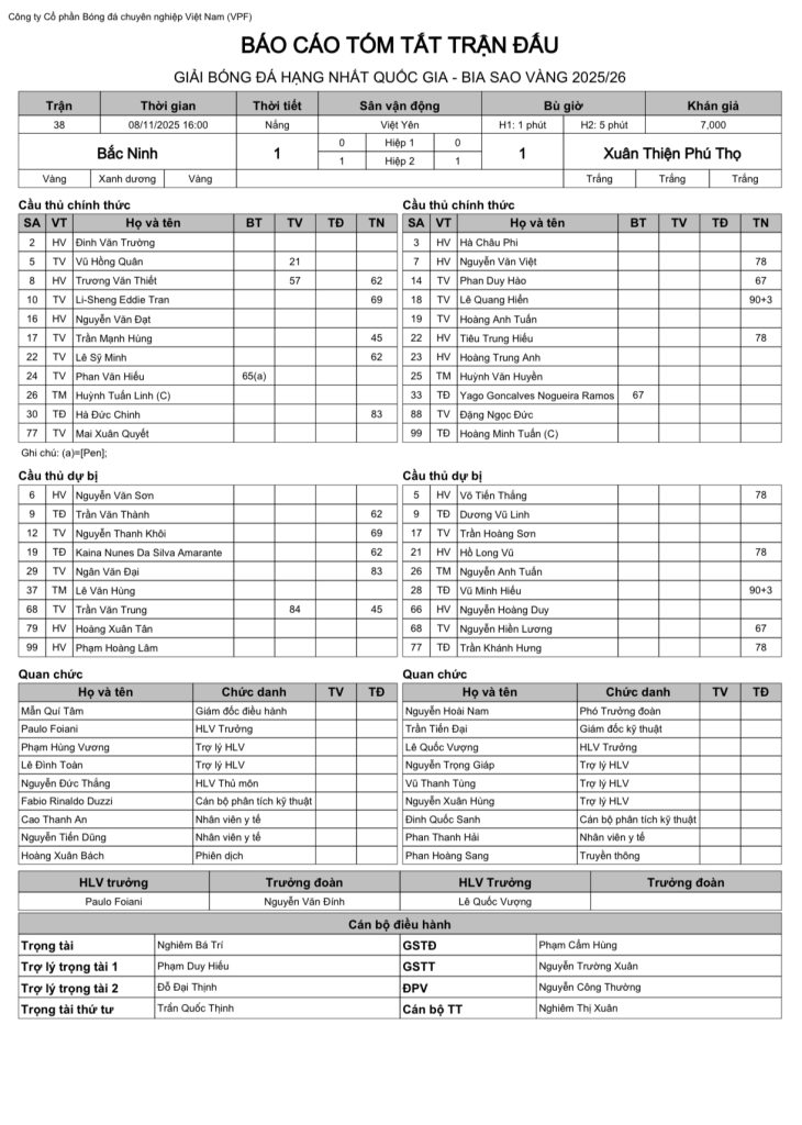 Báo cáo trận đấu CLB Bắc Ninh vs CLB Xuân Thiện Phú Thọ (vòng 7 HNQG Bia Sao Vàng 2025/26)