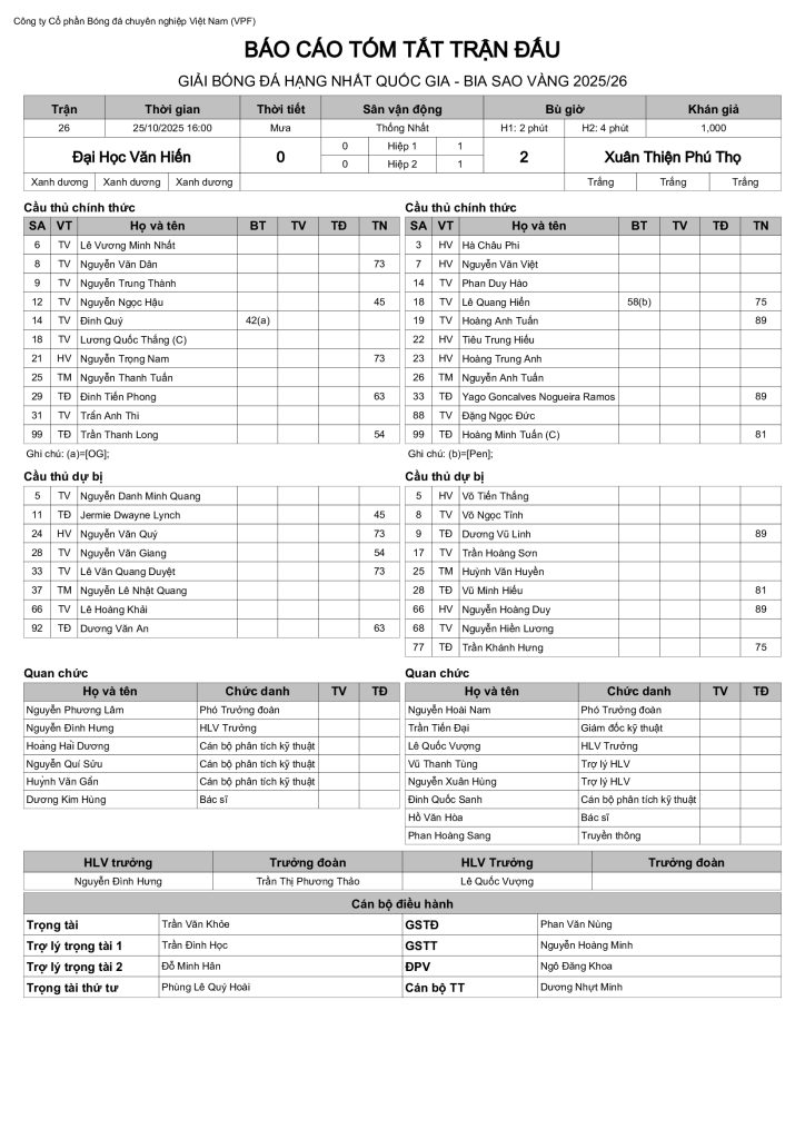 Báo cáo trận đấu CLB Đại Học Văn Hiến vs CLB Xuân Thiện Phú Thọ (vòng 5 HNQG Bia Sao Vàng 2025/26)