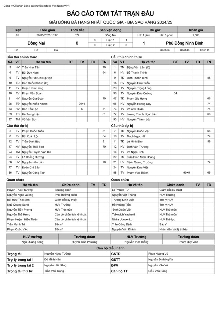 Báo cáo trận đấu CLB Đồng Nai vs CLB Phù Đổng Ninh Bình (vòng 20 HNQG Bia Sao Vàng 2024/25)