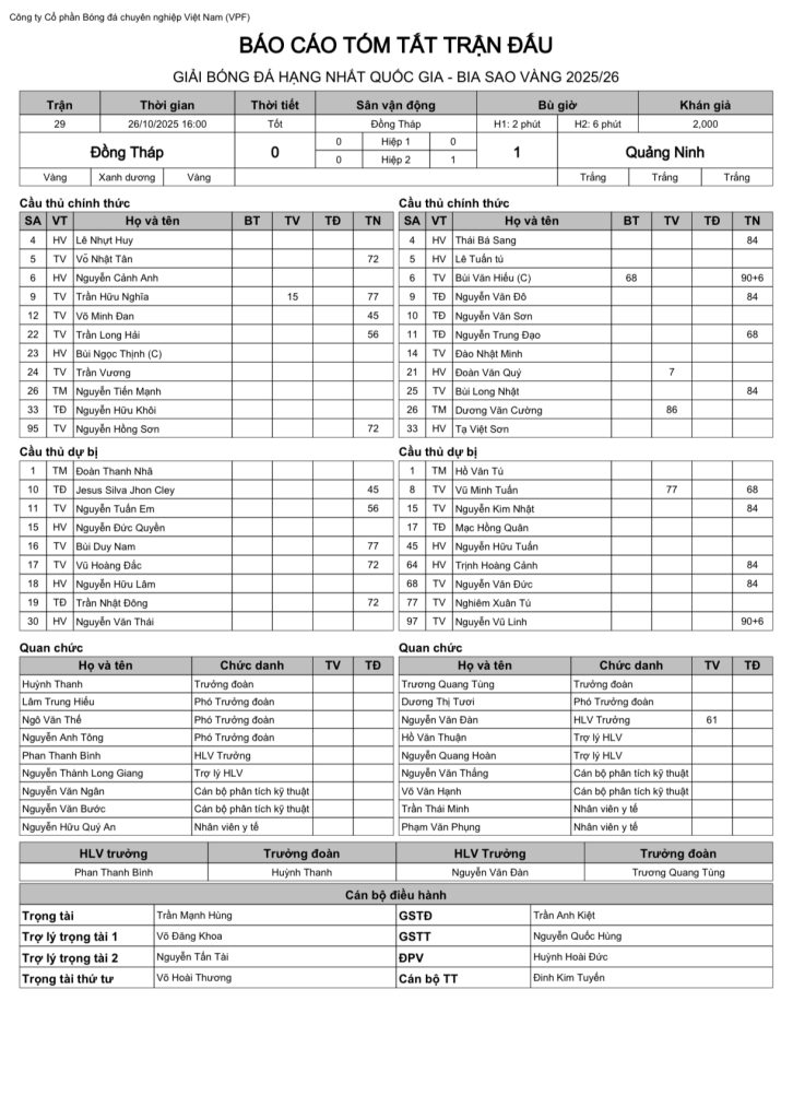 Báo cáo trận đấu CLB Đồng Tháp vs CLB Quảng Ninh (vòng 5 HNQG Bia Sao Vàng 2025/26)