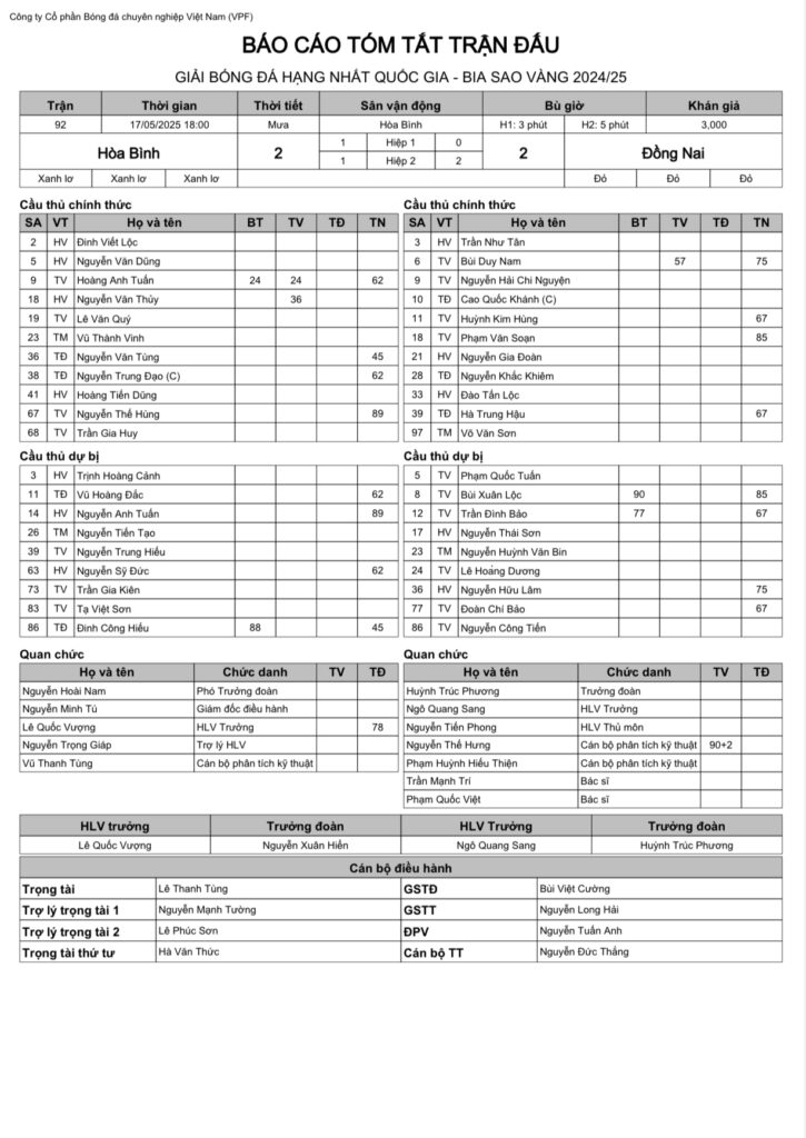 Báo cáo trận đấu CLB Hoà Bình vs Đồng Nai (vòng 19 HNQG Bia Sao Vàng 2024/25)
