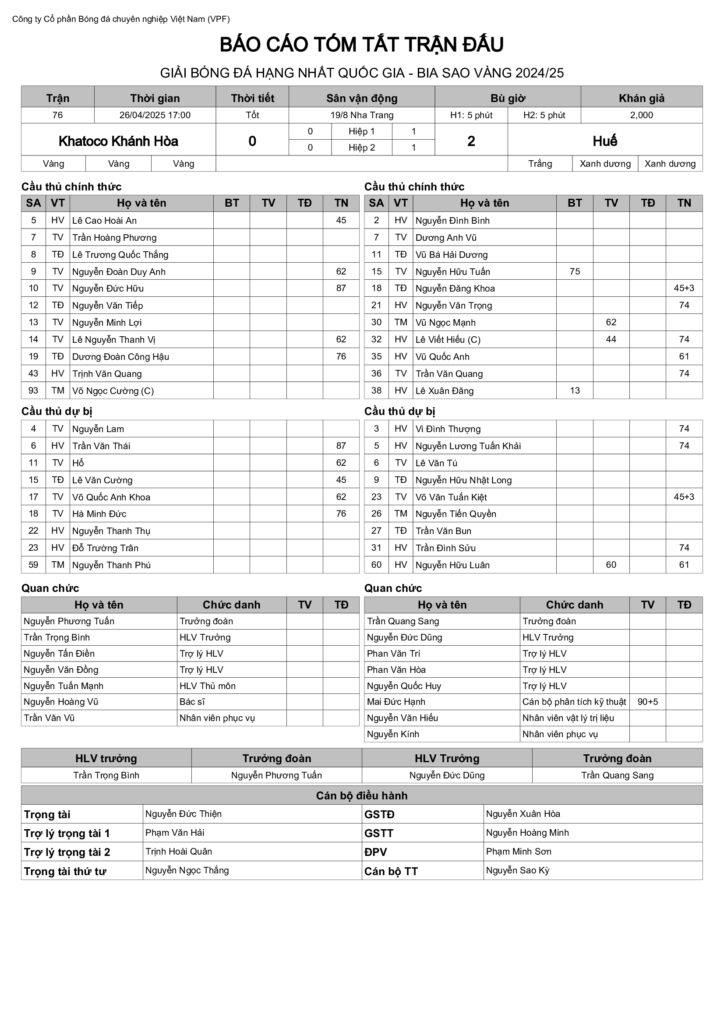 Báo cáo trận đấu CLB Khatoco Khánh Hòa vs CLB Huế (vòng 16 HNQG Bia Sao Vàng 2024/25)