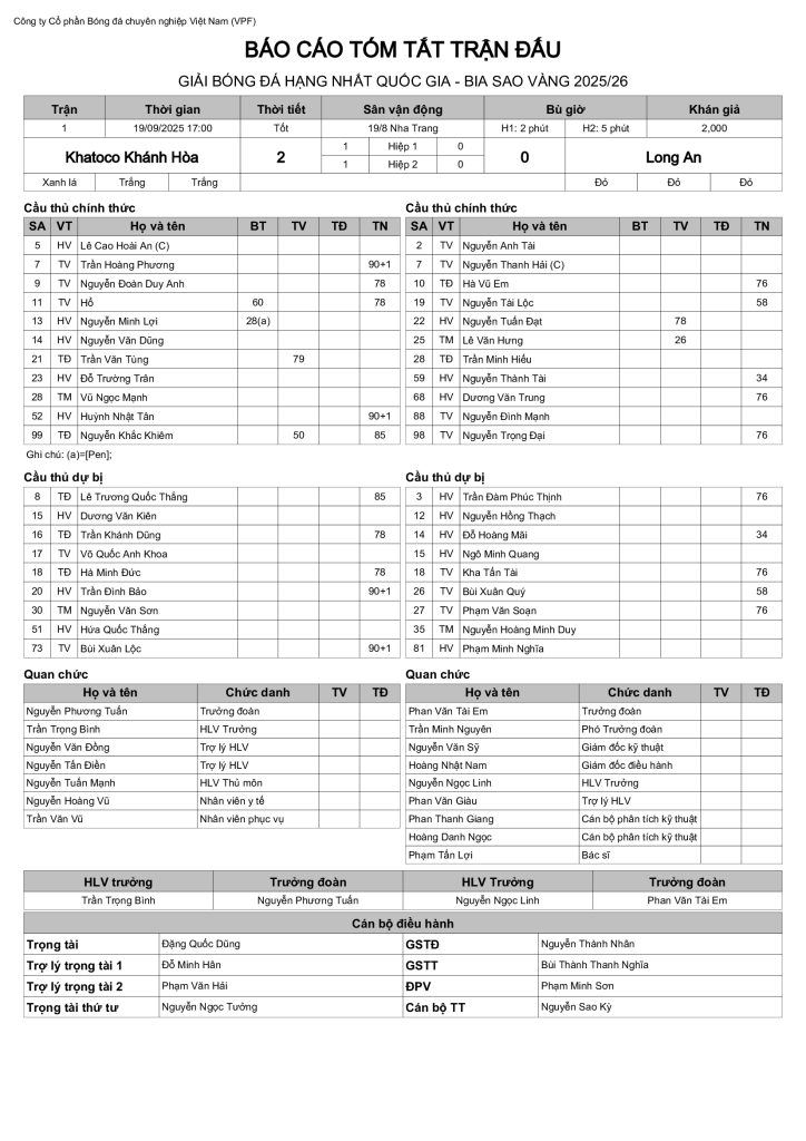 Báo cáo trận đấu CLB Khatoco Khánh Hòa vs CLB Long An (vòng 1 HNQG Bia Sao Vàng 2025/26)