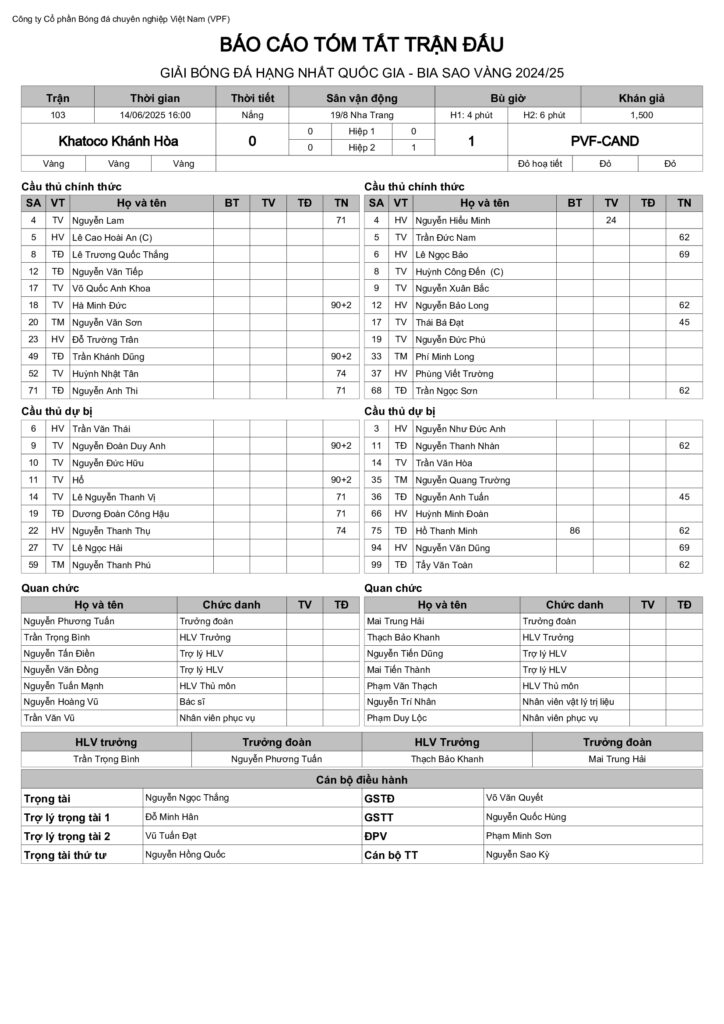 Báo cáo trận đấu CLB Khatoco Khánh Hoà vs CLB PVF CAND (vòng 21 HNQG Bia Sao Vàng 2024/25)
