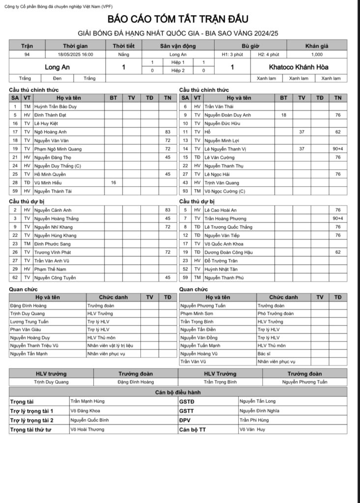Báo cáo trận đấu CLB Long An vs CLB Khatoco Khánh Hoà (vòng 19 Giải HNQG Bia Sao Vàng 2024/25)