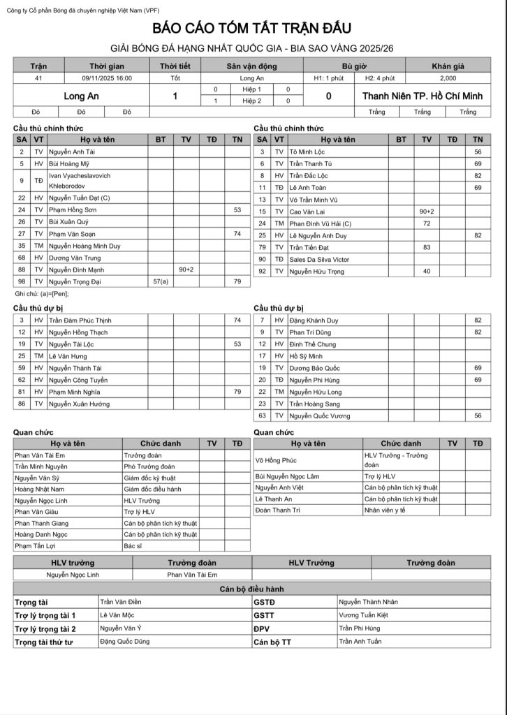 Báo cáo trận đấu CLB Long An vs CLB Thanh Niên TP.HCM (vòng 7 Giải HNQG Bia Sao Vàng 2025/26)