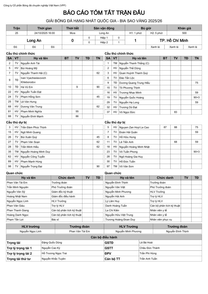 Báo cáo trận đấu CLB Long An vs CLB TP Hồ Chí Minh (vòng 5 HNQG Bia Sao Vàng 2025/26)