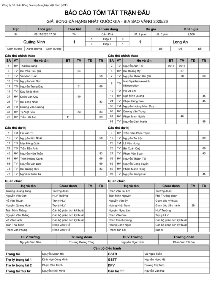 Báo cáo trận đấu CLB Quảng Ninh vs Long An (vòng 6 Giải HNQG Bia Sao Vàng 2025/26)