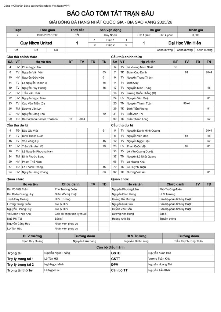 Báo cáo trận đấu CLB Quy Nhơn United vs CLB Đại Học Văn Hiến (vòng 1 HNQG Bia Sao Vàng 2025/26)