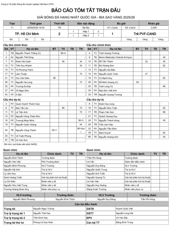 Báo cáo trận đấu CLB TP.Hồ Chí Minh vs CLB Trẻ PVF-CAND (vòng 2 Giải HNQG Bia Sao Vàng 2025/26)