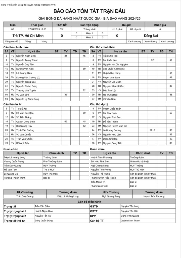 Báo cáo trận đấu CLB Trẻ TP.HCM vs CLB Đồng Nai (vòng 16 Giải HNQG Bia Sao Vàng 2024/25)