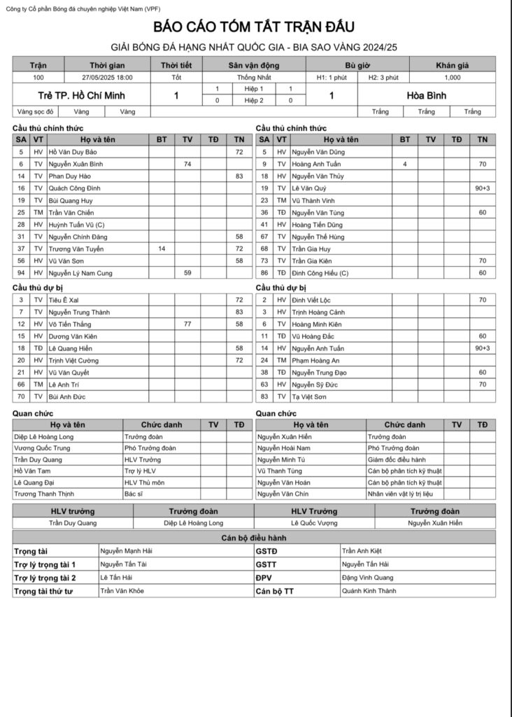 Báo cáo trận đấu CLB Trẻ TP.Hồ Chí Minh vs CLB Hoà Bình (vòng 20 Giải HNQG Bia Sao Vàng 2024/25)