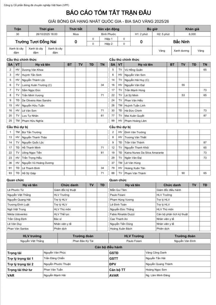 Báo cáo trận đấu CLB Trường Tươi Đồng Nai vs CLB Bắc Ninh (vòng 5 HNQG Bia Sao Vàng 2025/26)