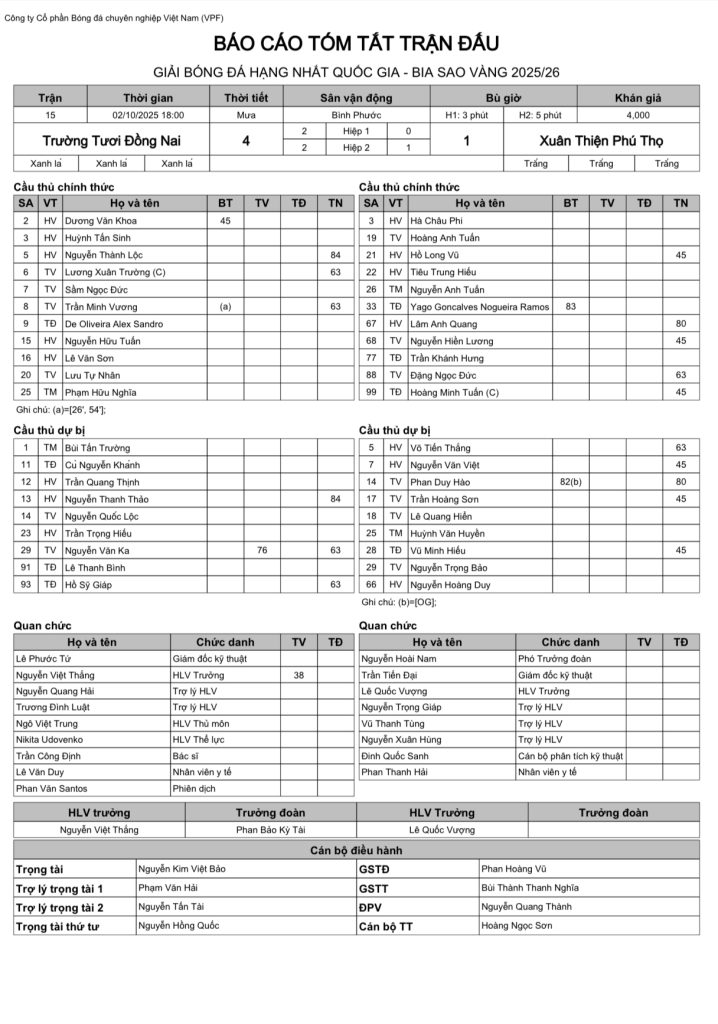 Báo cáo trận đấu CLB Trường Tươi Đồng Nai vs CLB Xuân Thiện Phú Thọ (Vòng 3 Giải HNQG Bia Sao Vàng 2025/26)