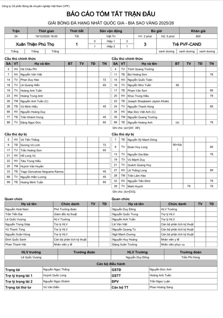 Báo cáo trận đấu CLB Xuân Thiện Phú Thọ vs CLB Trẻ PVFCAND (vòng 4 Giải HNQG Bia Sao Vàng 2025/26)