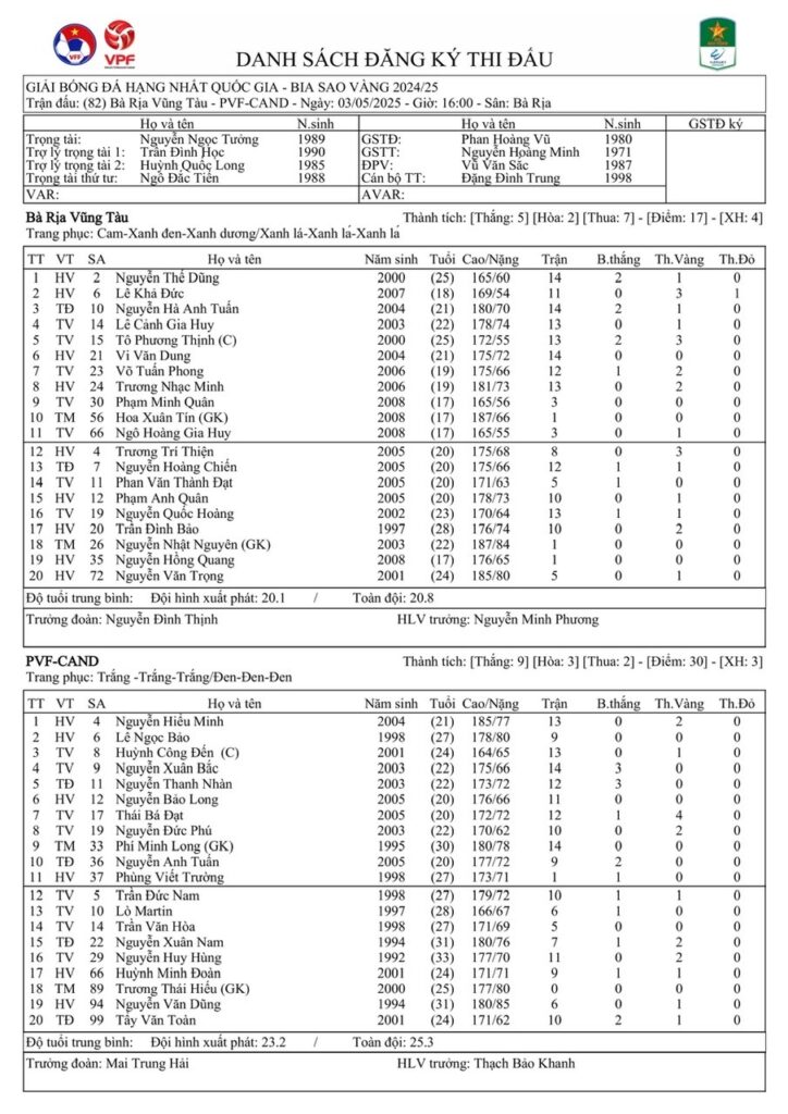 Danh sách đăng ký thi đấu CLB Bà Rịa Vũng Tàu vs CLB PVF CAND (vòng 17 HNQG Bia Sao Vàng 2024/25)