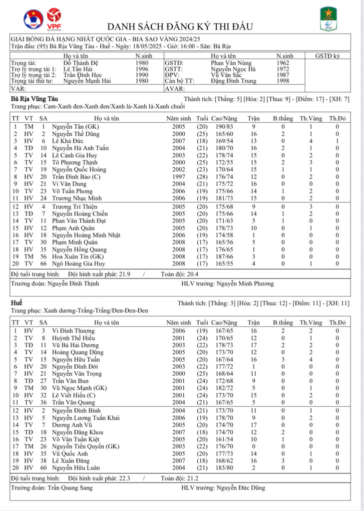 Danh sách đăng ký thi đấu CLB BRVT vs CLB Huế (vòng 19 Giải HNQG Bia Sao Vàng 2024/25)
