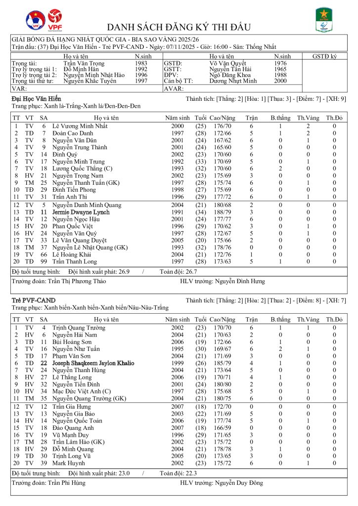 Danh sách đăng ký thi đấu CLB Đại Học Văn Hiến vs CLB Trẻ PVF CAND (vòng 7 HNQG Bia Sao Vàng 2025/26)