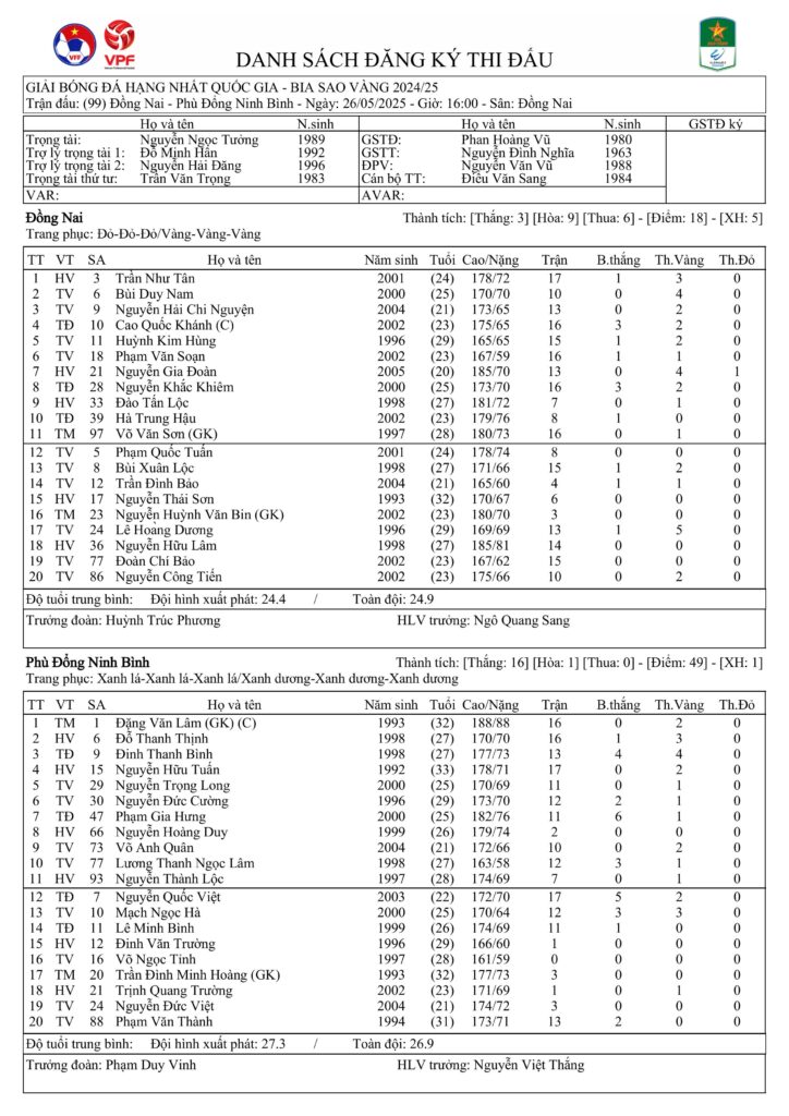 Danh sách đăng ký thi đấu CLB Đồng Nai vs CLB Phù Đổng Ninh Bình (vòng 20 HNQG Bia Sao Vàng 2024/25)