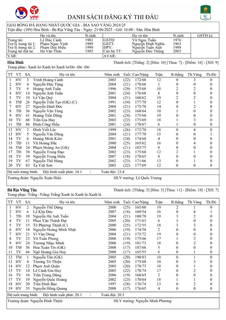 Danh sách đăng ký thi đấu CLB Hoà Bình vs CLB Bà Rịa Vũng Tàu (vòng 22 HNQG Bia Sao Vàng 2024/25)