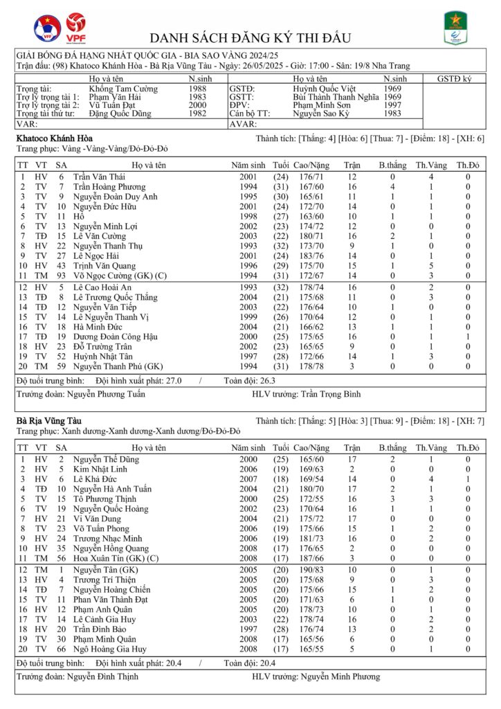 Danh sách đăng ký thi đấu CLB Khatoco Khánh Hòa vs CLB Bà Rịa Vũng Tàu (vòng 20 HNQG Bia Sao Vàng 2024/25)