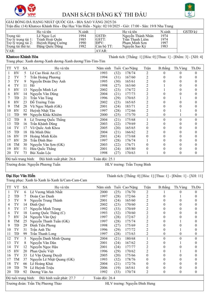 Danh sách đăng ký thi đấu CLB Khatoco Khánh Hòa vs CLB Đại học Văn Hiến (Vòng 3 Giải HNQG Bia Sao Vàng 2025/26)