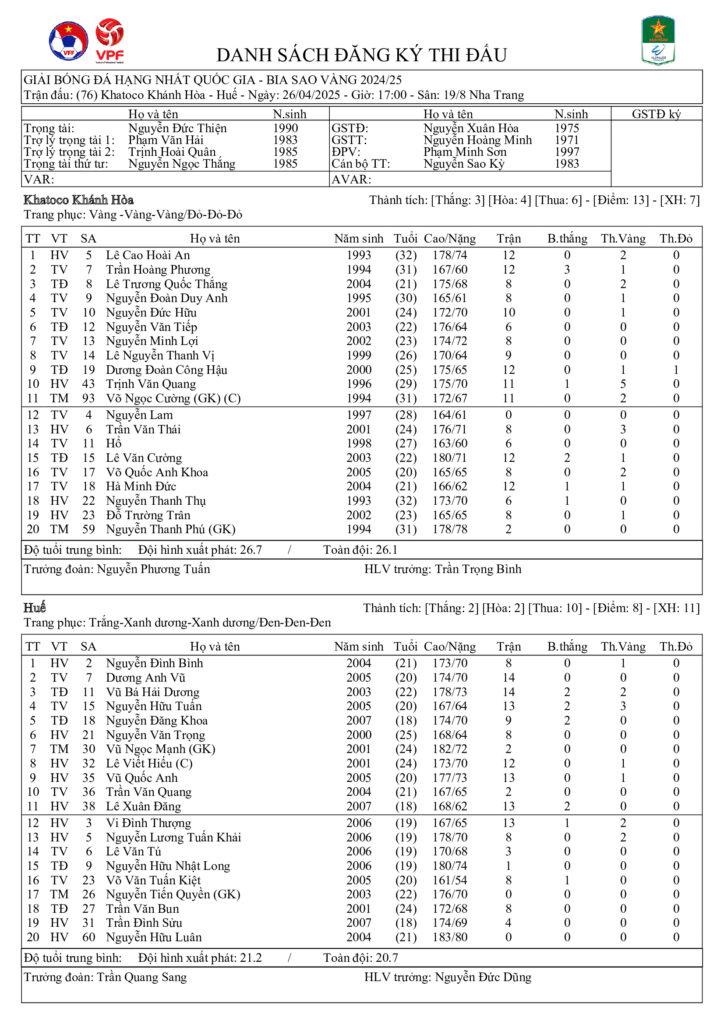 Danh sách đăng ký thi đấu CLB Khatoco Khánh Hòa vs CLB Huế (vòng 16 HNQG Bia Sao Vàng 2024/25)