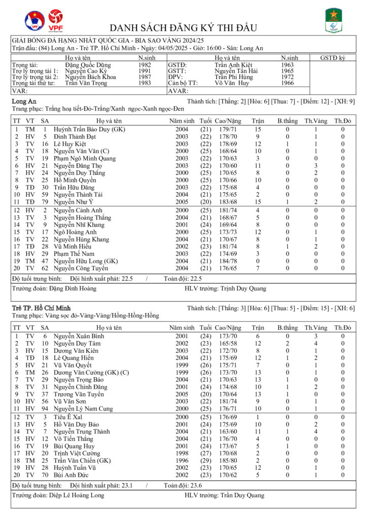 Danh sách đăng ký thi đấu CLB Long An vs CLB Trẻ TP.HCM (vòng 17 HNQG Bia Sao Vàng 2024/25)