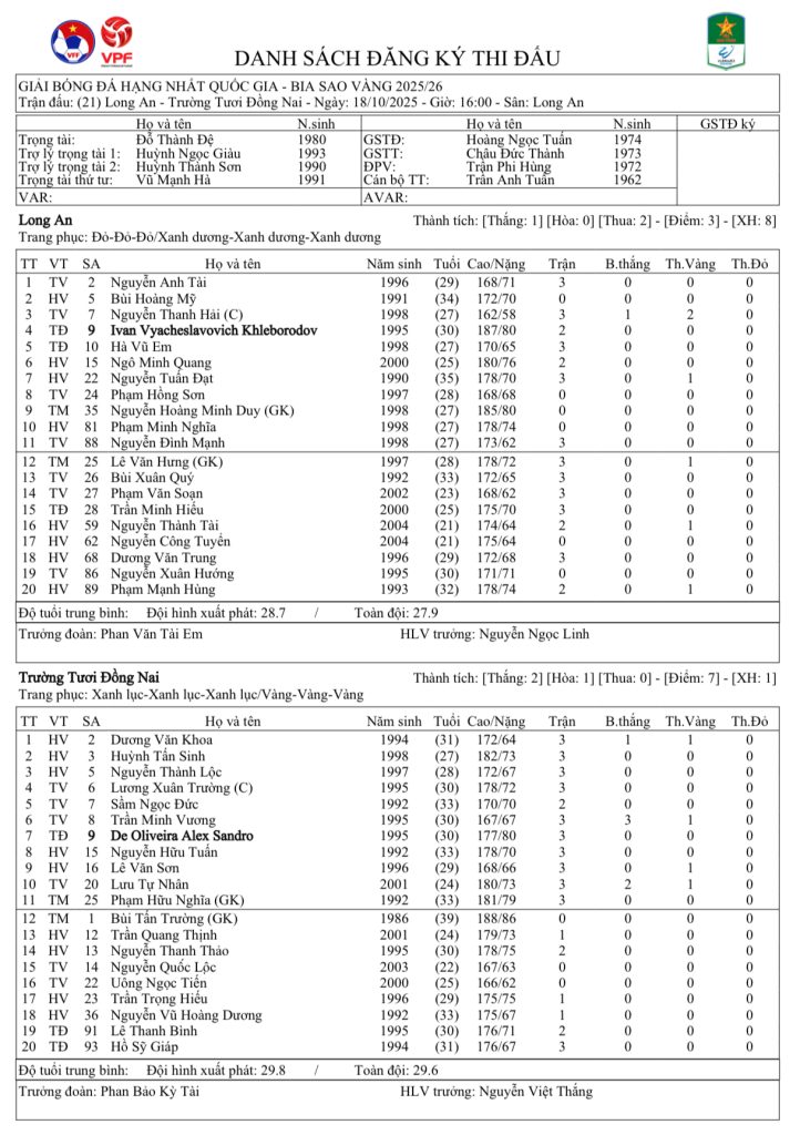 Danh sách đăng ký thi đấu CLB Long An vs CLB Trường Tươi Đồng Nai (vòng 4 Giải HNQG Bia Sao Vàng 2025/26)