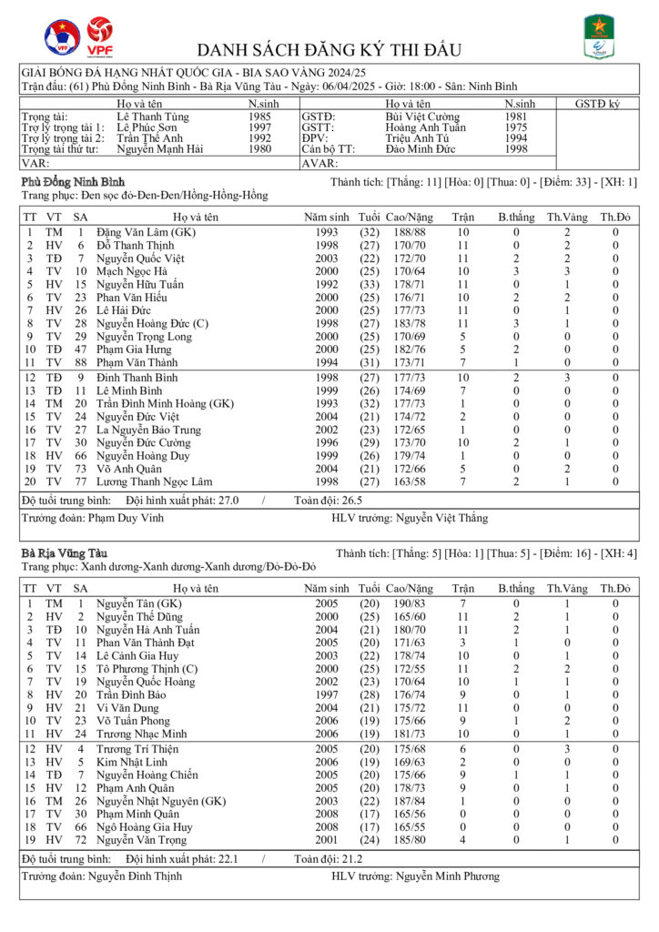 Danh sách đăng ký thi đấu CLB Phù Đổng Ninh Bình vs CLB Bà Rịa Vũng Tàu (vòng 13 HNQG Bia Sao Vàng 2024/25)