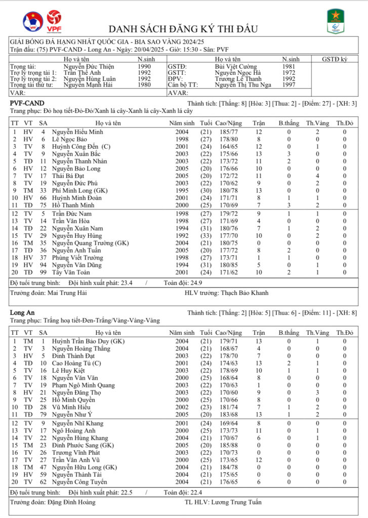 Danh sách đăng ký thi đấu CLB PVFCAND vs CLB Long An (vòng 15 Giải HNQG Bia Sao Vàng 2024/25)
