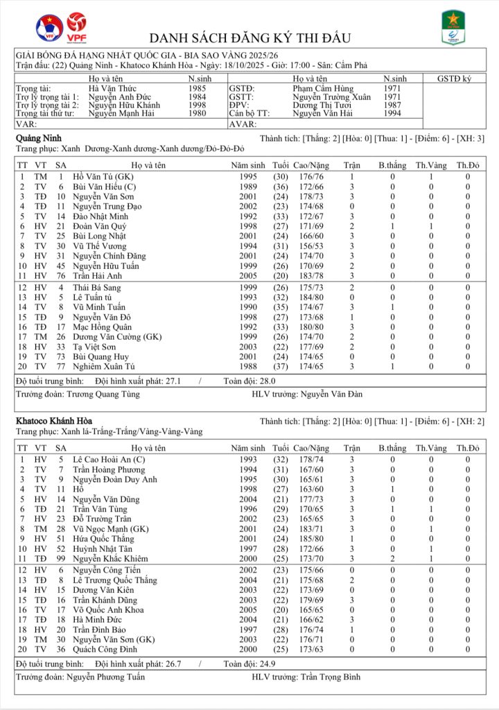 Danh sách đăng ký thi đấu CLB Quảng Ninh vs CLB Khatoco Khánh Hoà (vòng 4 Giải HNQG Bia Sao Vàng 2025/26)