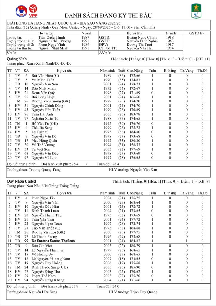 Danh sách đăng ký thi đấu CLB Quảng Ninh vs CLB Quy Nhơn United (vòng 2 Giải HNQG Bia Sao Vàng 2025/26)