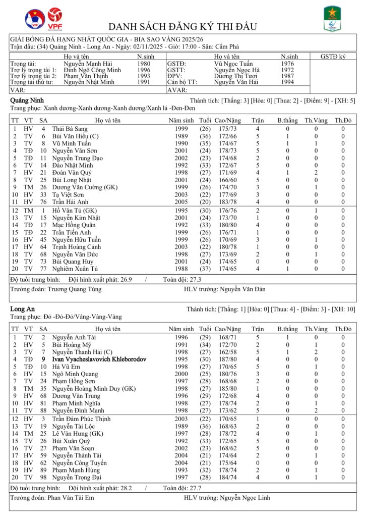 Danh sách đăng ký thi đấu CLB Quảng Ninh vs Long An (vòng 6 Giải HNQG Bia Sao Vàng 2025/26)