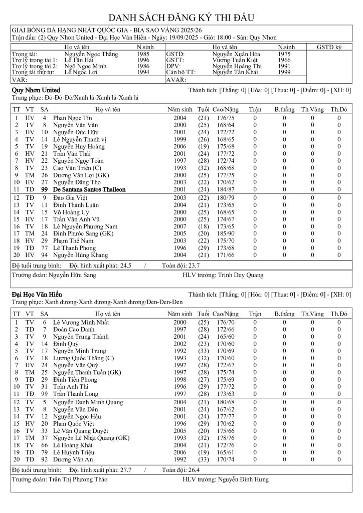 Danh sách đăng ký thi đấu CLB Quy Nhơn United vs CLB Đại Học Văn Hiến (vòng 1 HNQG Bia Sao Vàng 2025/26)