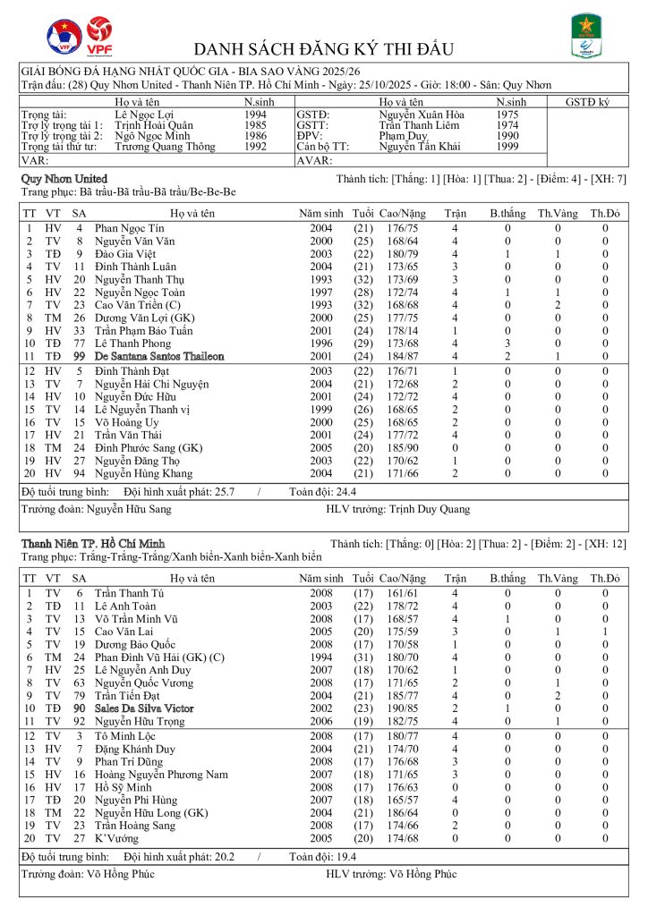 Danh sách đăng ký thi đấu CLB Quy Nhơn United vs CLB Thanh Niên TP Hồ Chí Minh (vòng 5 HNQG Bia Sao Vàng 2025/26)