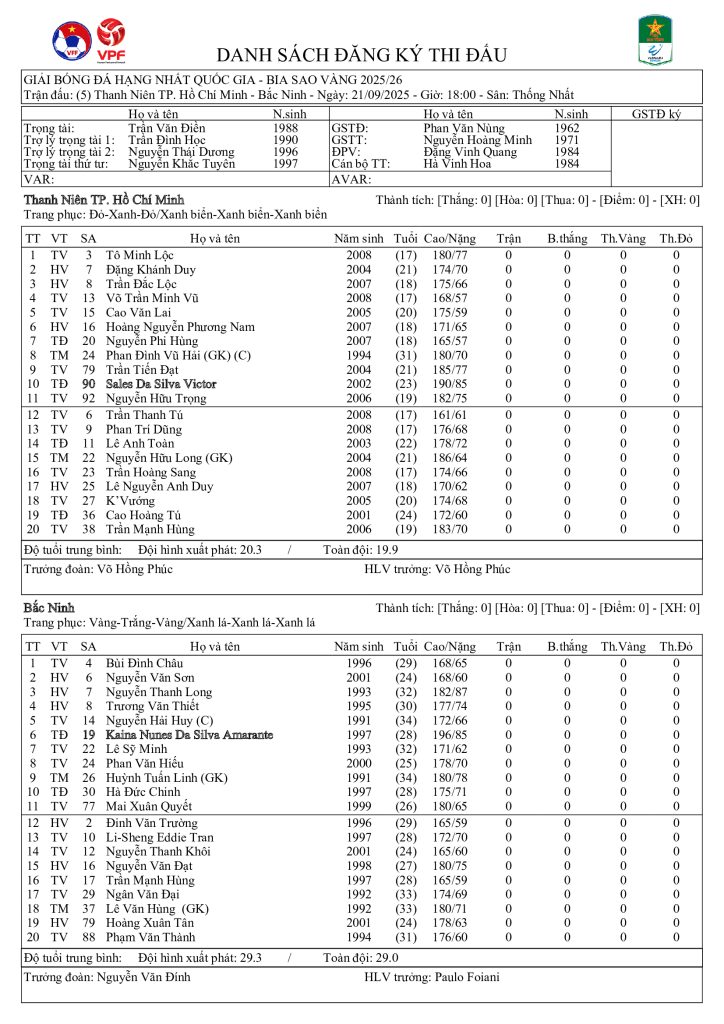 Danh sách đăng ký thi đấu CLB Thanh Niên TP Hồ Chí Minh vs CLB Bắc Ninh (vòng 1 Giải HNQG Bia Sao Vàng 2025/26)