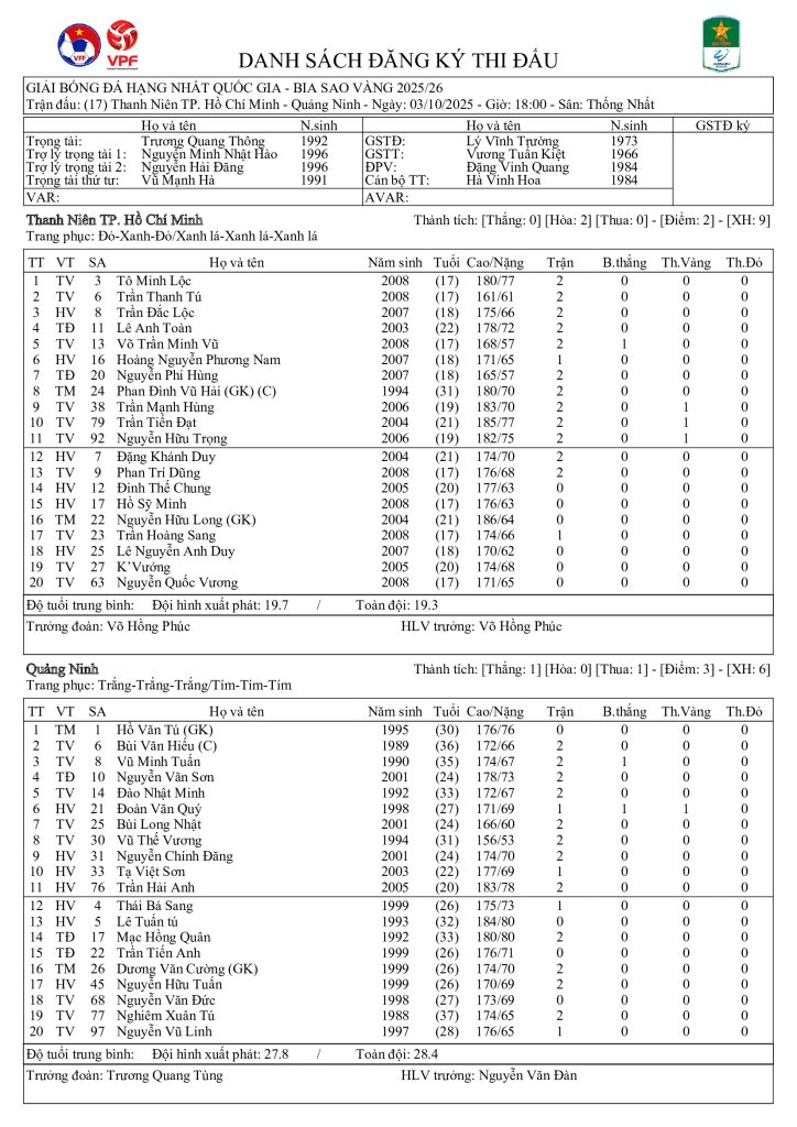 Danh sách đăng ký thi đấu CLB Thanh Niên TP Hồ Chí Minh vs CLB Quảng Ninh (vòng 3 HNQG Bia Sao Vàng 2025/26)